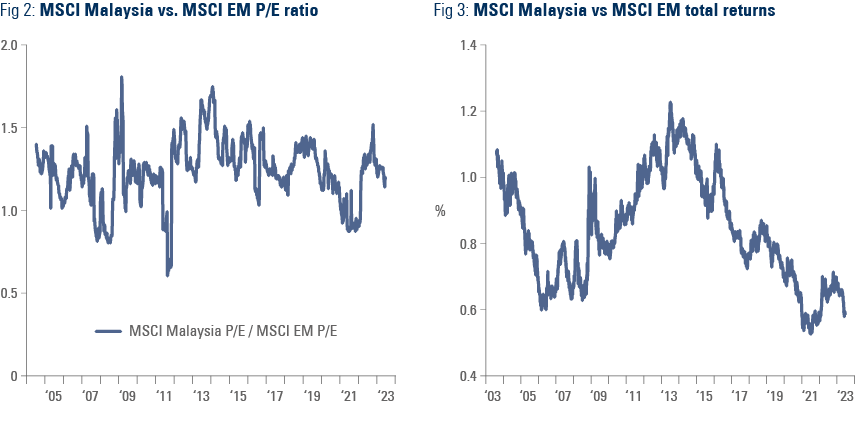 It is highly encouraging to see Malaysia’s government proactively taking tough decisions in good times. Several frontier and EM countries like Egypt, Nigeria, and Türkiye, for example, only did so when close to the brink. However, the removal of fuel subsidies and higher taxes are one element that local investors mentioned in forming their downbeat view for asset prices. Locals fear removing fuel subsidies will lead to higher costs which, alongside higher taxation, will squeeze companies’ margins. Indeed, this already seems to be priced into Malaysian stocks, which sold to the lowest level since the 2020 and 2008 shocks as per Figure 1: