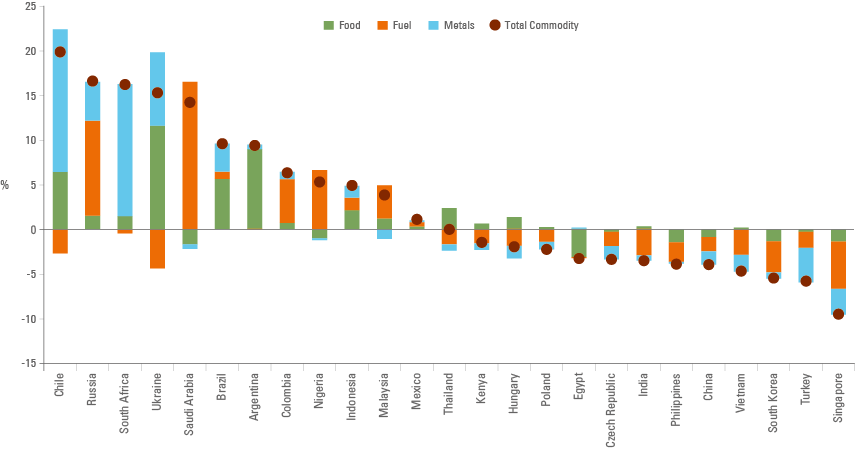 Russia’s invasion of the Ukraine exacerbated already constrained commodity markets including energy, fertilizers, food, and some industrial metals. JP Morgan estimates a current global commodity inventory of 64 days. This compares to 70 days a year ago and 76 days five years ago. According to Citibank, the value of commodities consumed globally has increased from $6.3 trillion in 2019 to $12.5 trillion, or from 6% to 13% of the world’s GDP. This is triggering a positive terms of trade shock and a transfer of wealth in favour of commodity exporters, many of which are in Emerging Markets.