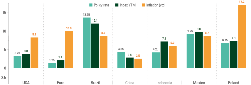 In a hyper-financialised world characterised by significant levels of debt, monetary policy has become a disproportionately important driver of market performance. It is our view that, after making a policy mistake in 2021, by not tightening policy rates in an economic boom (high growth and high inflation), developed markets have been guilty of being reactive to persistently high inflationary pressure. This has triggered investor uncertainty and market volatility at the expense of risk assets. Meanwhile, Emerging Markets have been largely orthodox and increased policy rates pre-emptively and predictably. This has helped anchor inflation expectations as per figure 3.