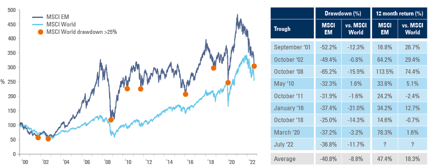 The unstable global macroeconomic backdrop has provoked indiscriminate selling pressure and attractive investment opportunities. In the past two decades, Emerging Markets have witnessed eight drawdowns over 25% and over the following 12 months the MSCI Emerging Markets index has returned over 47% on average, 18% ahead of the MSCI World index.