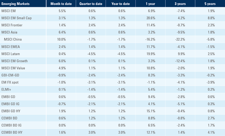 *Price only. Does not include carry. Index Definitions: VIX Index = Chicago Board Options Exchange SPX Volatility Index. DXY Index = The Dollar Index. CRY Index = Thomson Reuters/CoreCommodity CRM Commodity Index. Source: Bloomberg, JP Morgan, Barclays, Merrill Lynch, Chicago Board Options Exchange, Thomson Reuters, MSCI, total returns. Figures for more than one year are annualised other than in the case of currencies, commodities and the VIX, DXY and CRY which are shown as percentage change.