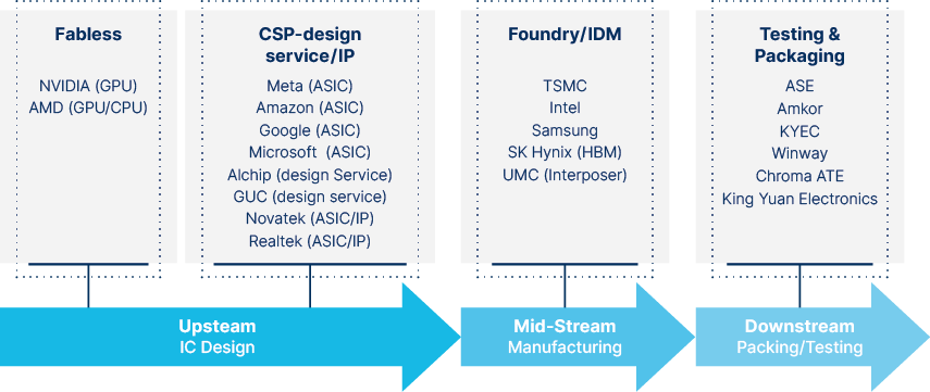 - Packaging: AI chips often require advanced packaging techniques to accommodate their higher performance requirements. Taiwan leads in deploying innovative packaging solutions, such as ‘2.5/3D’.