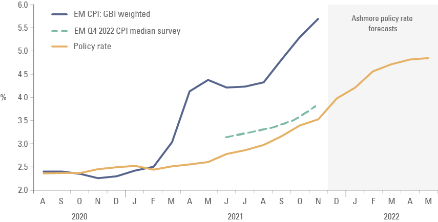 In sharp contrast, EM did not subscribe to the ‘transitory inflation’ thesis. Despite experiencing much larger output gaps than DM economies, EM central banks tightened monetary policy during 2021, and are now ahead of the curve in the process of controlling inflation as EM policy rates was above 2022 inflation expectations (Figure 10) already in mid-December.