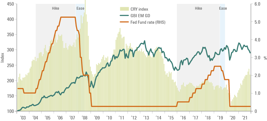 Fig 11: EM local currency bond total returns vs. Fed Fund & Commodity