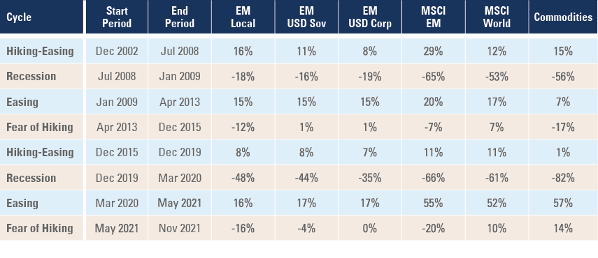 On the other hand, EM assets sold-off during recessions, as the MSCI EM marginally underperformed the MSCI World in the worst drawdowns of the past 20-years. In relative terms, EM assets underperformed the most during when the market is starting to price in a hiking cycle (fear of hiking).
