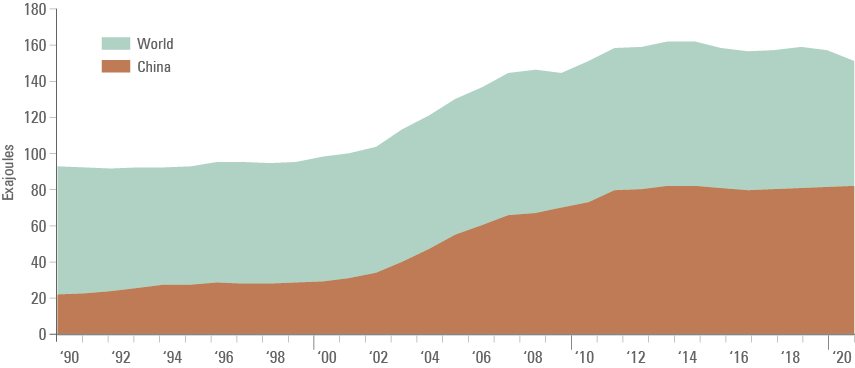 Fig 19: Coal consumption: World and China (in exajoules)10