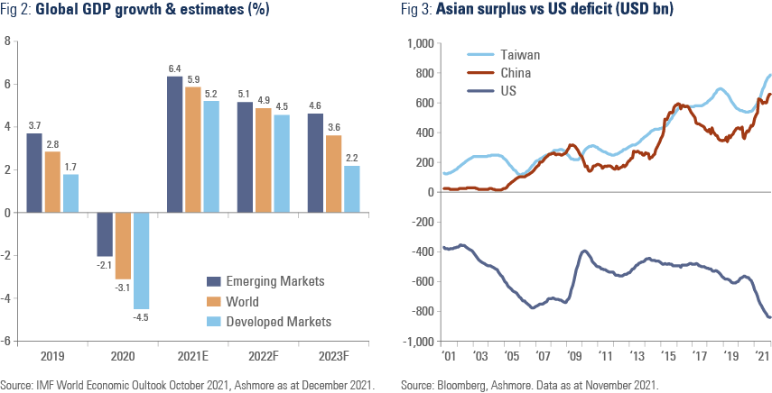 In our view, 2022 EM assets are likely to perform well as China eases monetary policy, leading for a stabilisation and recovery in GDP growth as the fear of Fed hikes gives way to a hiking cycle, an environment where EM assets performed well historically.