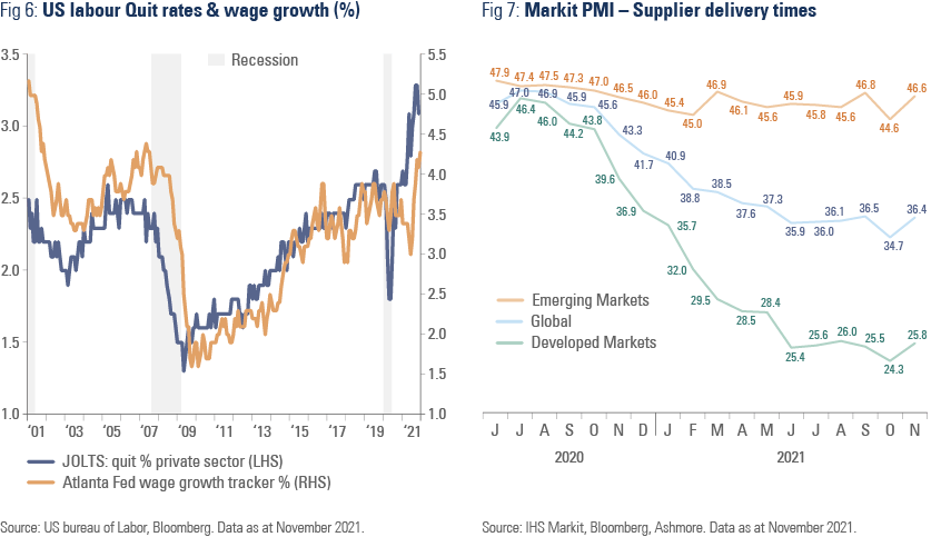 At the same time, excessive fiscal and monetary stimulus led the US economy to overheat. Half of all US small businesses are struggling to fill their vacancies right after a recession and at the same time quit rates have increased, driving wages higher (Figure 6). Labour markets are also tight in other DM economies like the United Kingdom.