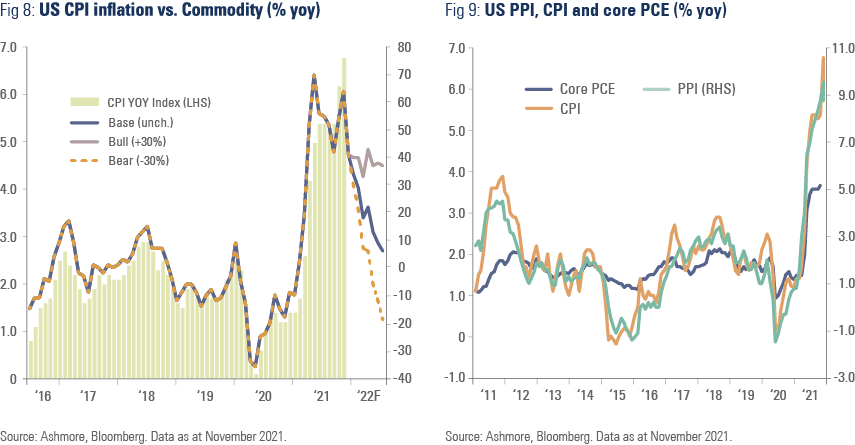 Overall, China’s real GDP is likely to expand at around 4.5% to 5.5% in 2022. Economic growth is likely to remain soft until Q1 2022 due to the ongoing slowdown in the housing sector and the Winter Olympics in Beijing keeping a lid on emissions, as the leadership want to display blue skies to the world and keep the air clean for athletes. However, the economy should rebound during the year as the economy benefits from belated monetary policy easing. The People’s Bank of China (PBoC) lowered its reserve requirement ratio in 2021 and signalled further steps to ease monetary policy next year. Importantly the politburo has shifted its intended pace of economic rebalance, favouring stability and economic growth in lieu of common prosperity over the short-term. Fiscal policy is also turning counter-cyclical, leaning against the current economic slowdown.4