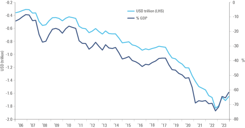 On the other hand, if and when the debt ceiling is lifted, the large issuance of Bills and Treasuries purchased by foreign investors could provide a short-term bid for the USD. Should interest rates rise because of an increase in the debt ceiling, the USD would rally first. This could be a tremendous opportunity to diversify away from the ‘greenback’, which currently trades at historically extreme levels as per Figure 1, and has significant external vulnerabilities, summarised by the massive net international liability of the US in Figure 2.