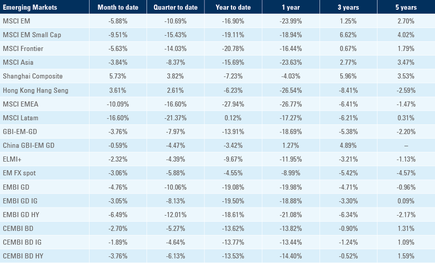 The risk of an energy crisis in Europe increased further as the G7 discussed a price cap on imports of oil from Russia and economic activity surprised to the downside in both Europe and the United States, led by very poor flash PMI surveys. Chinese President Xi Jinping pledged to achieve the 5.5% GDP growth target. Chile announced it will sell USD 5bn to lower CLP volatility. Colombia’s president elect said he is looking to reopen the border with Venezuela. Ecuador faced another week of protests as the National Assembly approved a motion to impeach the president. The World Bank pledged USD 2.3bn in assistance to African countries to avoid food crisis and the IMF reached an agreement to re-establish its loan programme with Pakistan. CPI inflation dropped marginally in Brazil but rose in Mexico. Mexico hiked policy rate by 75bps to 7.75% and Czech hiked 125bps to 7.0%. Saudi injected liquidity in the banking system and South Korea’s exports remained resilient, despite poor leading indicators from DM.